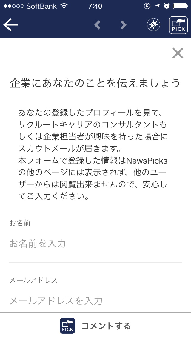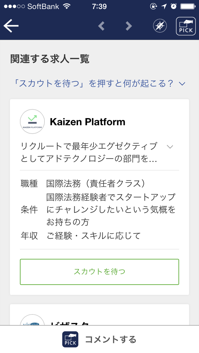 NewsPicks上に「キャリアストーリー」と呼ばれる求人特集記事を掲載し、興味のあるユーザーは「スカウトを待つ」ボタンをタップすることでNewsPicks内のデータベースに登録されます。その後、登録されたユーザーの情報を参照しその方に興味を持つ企業があれば、スカウトの連絡が入る仕組みとなります。この仕組みを通じ、自らのキャリアパスを考えるユーザーに対して、「自ら応募する」以外に「スカウトを待つ」という選択肢を提供したいと考えています。なお今回の取り組みにあたっては、「リクナビNEXT」「リクルートエージェント」などを提供する株式会社リクルートキャリアの協力の下、リクルートキャリアのサービスを利用する求人企業からスカウトが届くようになります。