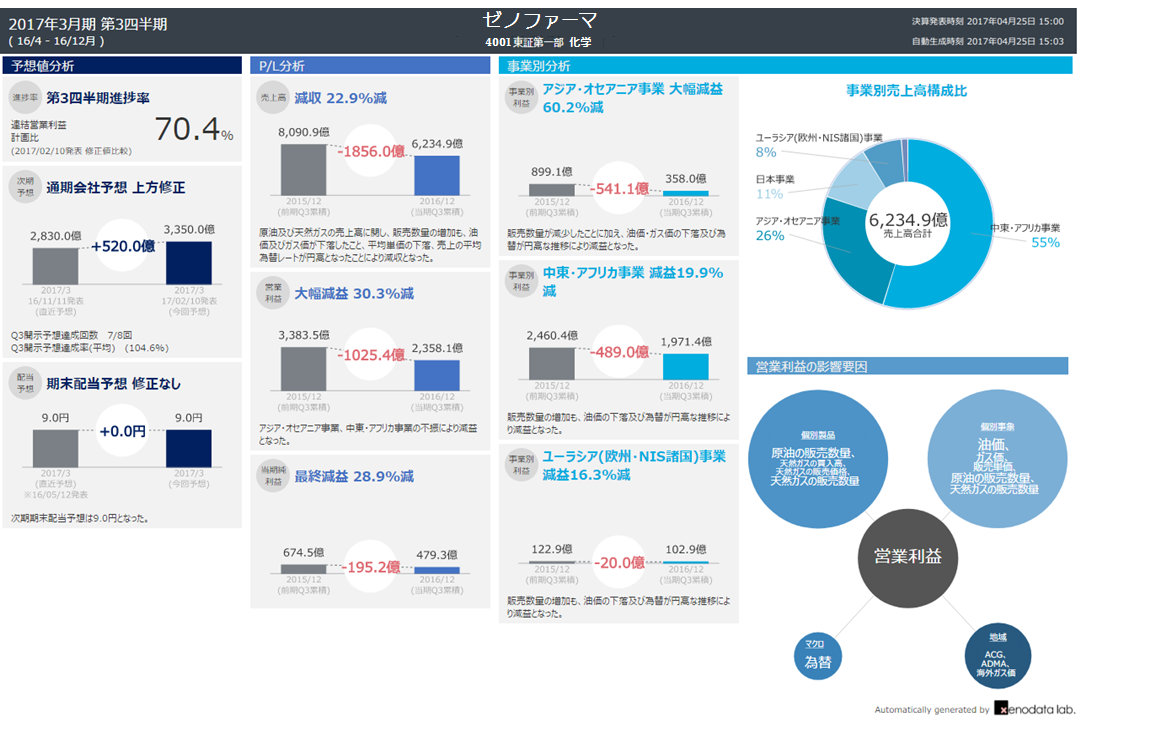 xenodata lab.は、自然言語処理を核とした企業・財務分析AI開発事業を行っています。また、個人投資家向けのAIによる自動生成決算分析レポート「xenoFlash(ゼノ・フラッシュ)」を主軸サービスとしており、日本の上場株式銘柄に特化して、企業の決算情報を収集し、その情報に含まれる自然言語も含めて分析し、要点をまとめてビジュアル化されたレポートを提供しています。