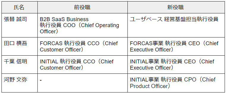 また、コーポレート、FORCAS事業及びINITIAL事業において、下記の通り新たに執行役員・事業CEOが就任いたします。